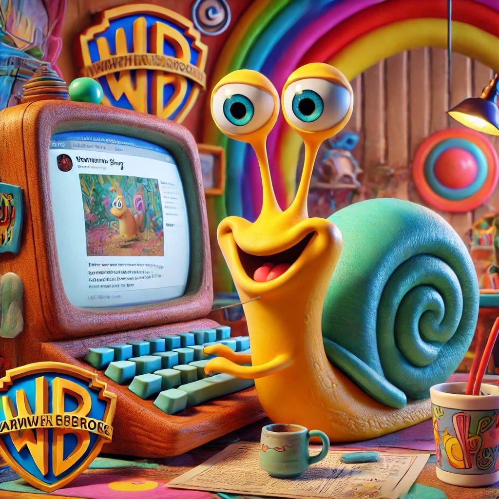 โGive me a picture of a snail posting a blog. Make it influenced by imagery from warner bros cartoonsโ - Dall-E, July 2024